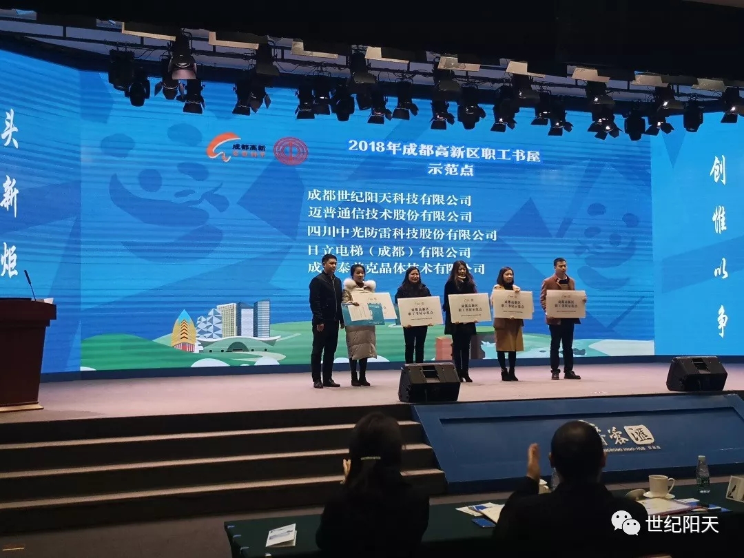2019年1月11日,在“2018年成都高新區(qū)工會工作總結(jié)會議暨‘學(xué)習(xí)中國工會十七大精神’宣講活動”的現(xiàn)場,高新區(qū)工會為我司授予“職工書屋示范點”榮譽牌匾。